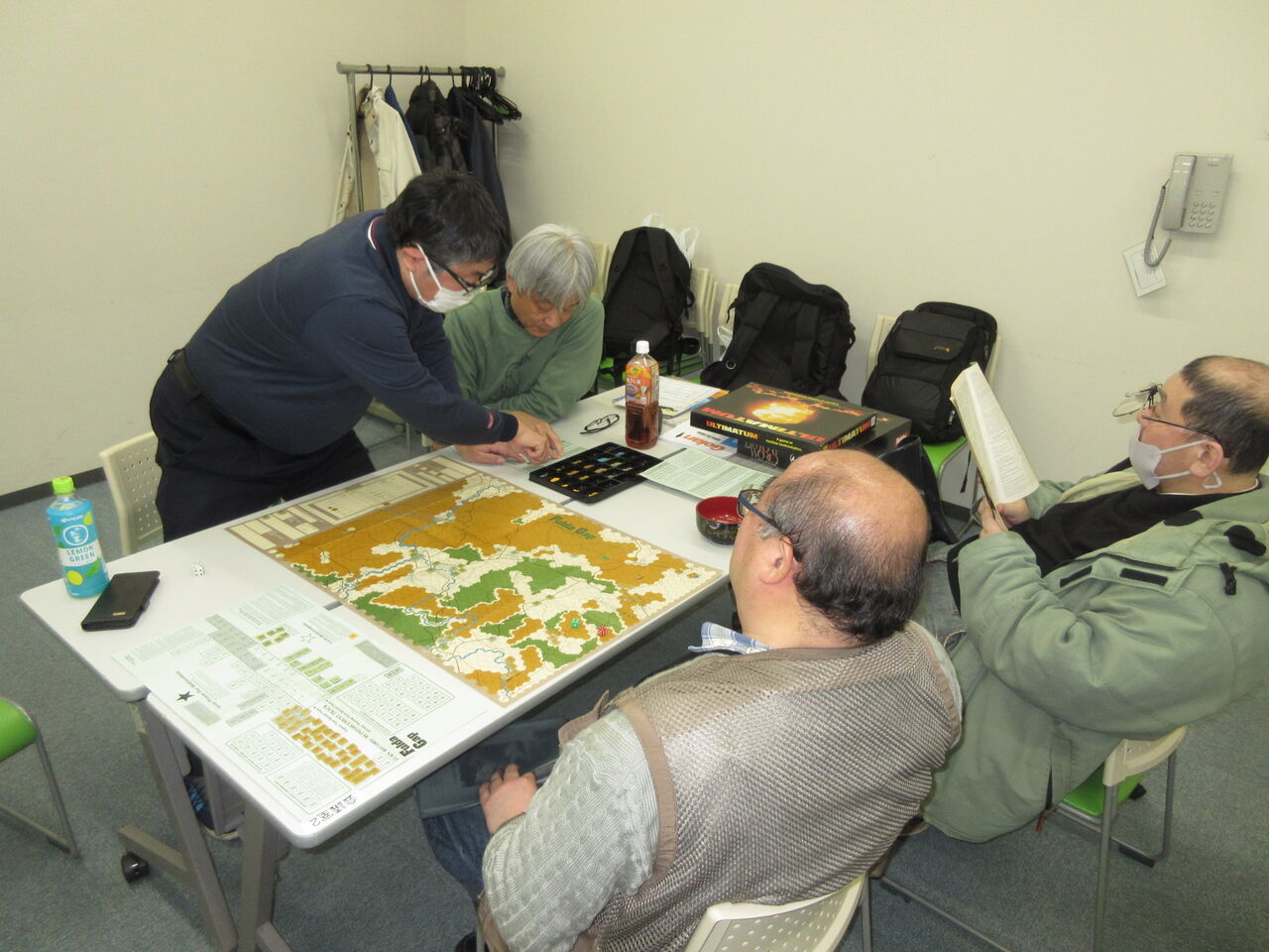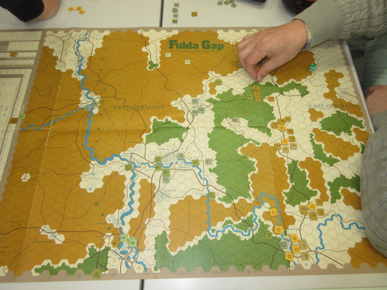 今は亡きSPIが製作したNATO対Warsaw Pactの作戦級「Fluda Gap」(SPI)をソ連軍(kawa)対アメリカ軍(morita)で対戦。ソ連軍はアントライドで、戦闘時に初めて戦力がわかるシステムで、Fulda渓谷で遅滞戦術に成功したアメリカ軍(morita)の勝利となりました。jさんとTommyさんが観戦武官として、初めて見る展開に盛り上がっていました。