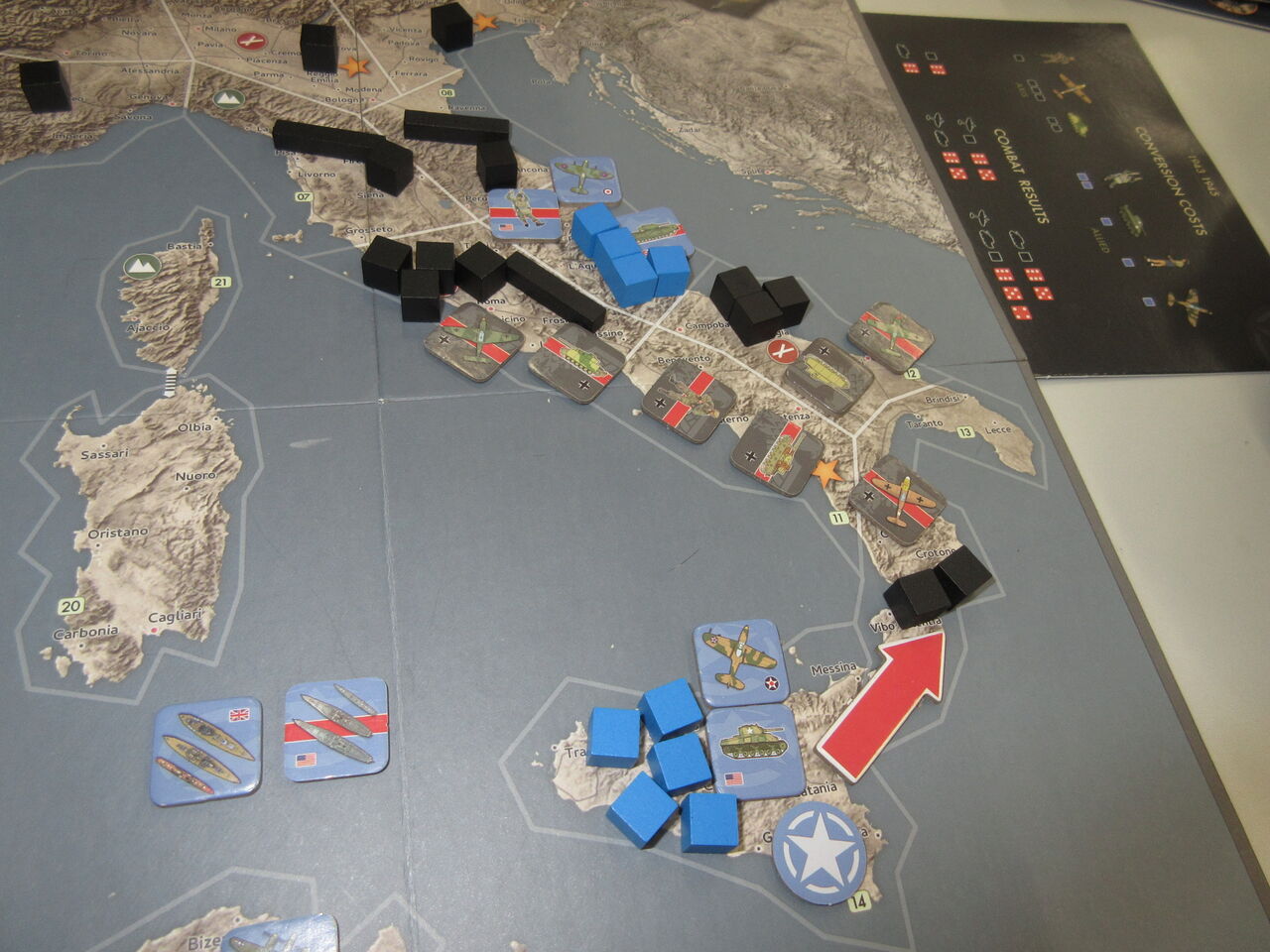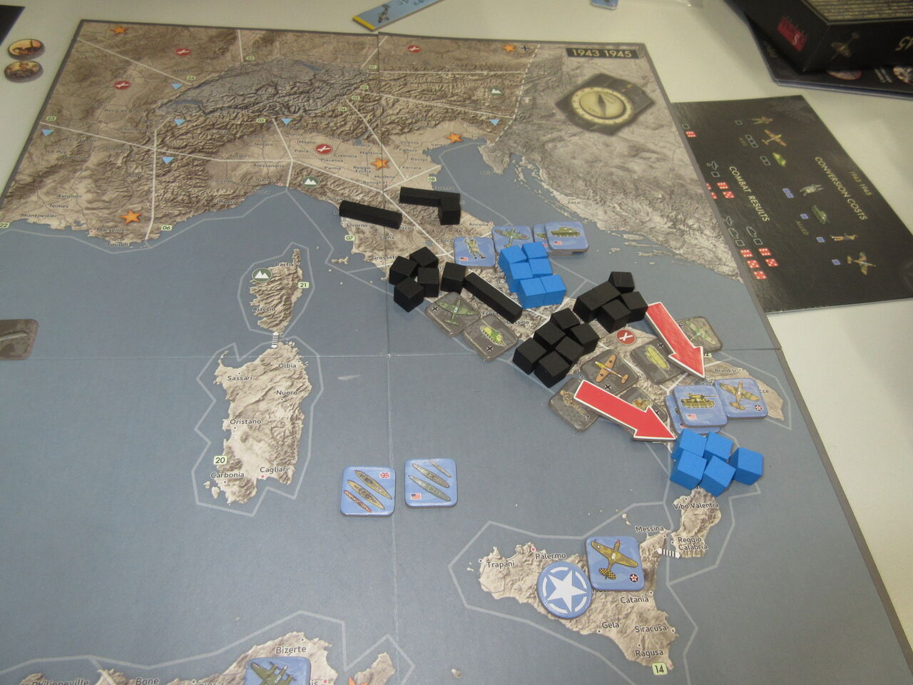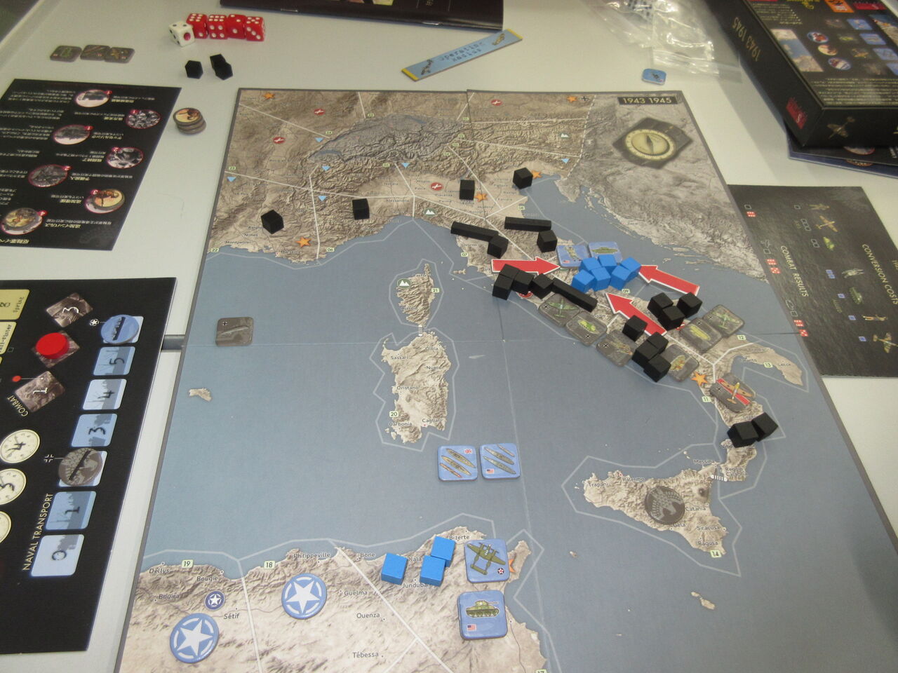 初プレイでしたが、シンプルなルールと多彩なイベントで、非常に楽しめました。制海権を持つ連合軍は、どこにでも上陸できるため、頻繁な強襲上陸と兵力の誘引、その上で別の箇所の攻略と、史実のような戦略が取れます。枢軸軍はそれに併せて兵力をシフトし、優秀な戦術的能力を駆使して、敵の撃退を試みます。今回は、幸いに連合軍が海に叩き落とされることはありませんでしたが、下手な上陸であれば(あるいはdrが偏れば)十分に起こりえました。販促の台詞通り「ルールはシンプルですが、(中略)両軍とも一定数のイベントを実行でき、戦いの流れを変えることも可能です」。これは、ぜひ、再戦したいものです。