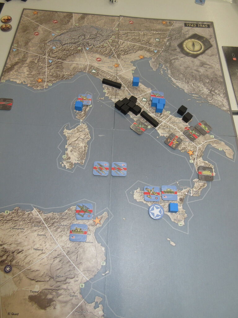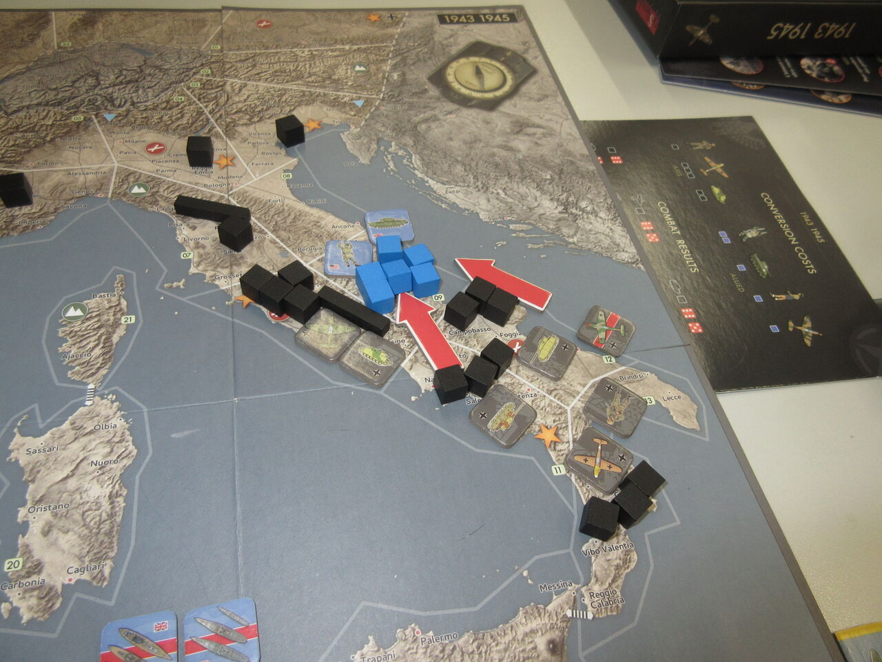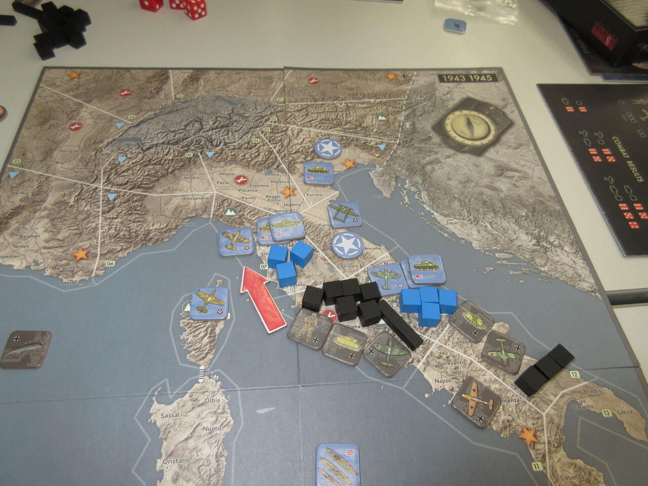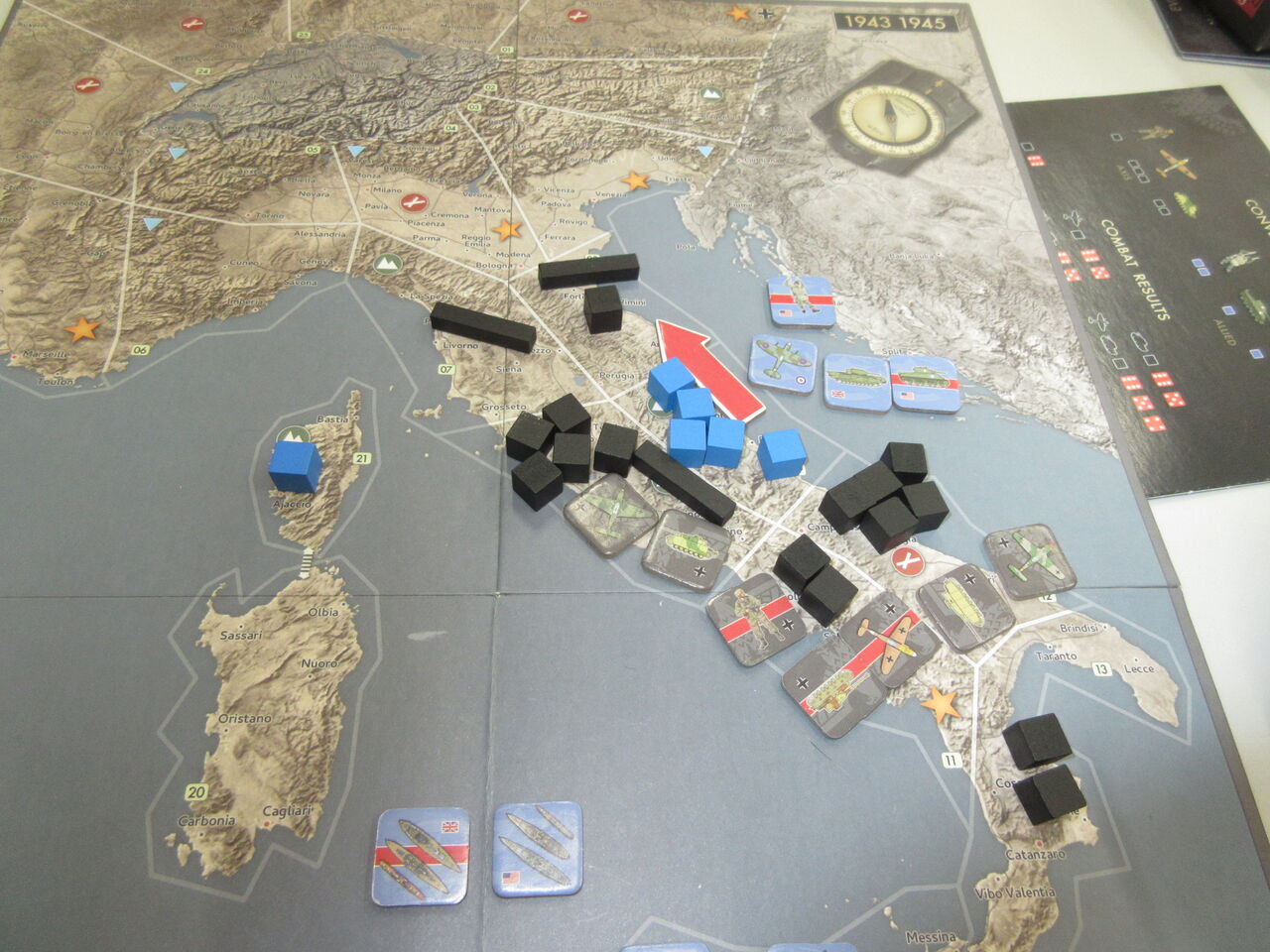 初プレイでしたが、シンプルなルールと多彩なイベントで、非常に楽しめました。制海権を持つ連合軍は、どこにでも上陸できるため、頻繁な強襲上陸と兵力の誘引、その上で別の箇所の攻略と、史実のような戦略が取れます。枢軸軍はそれに併せて兵力をシフトし、優秀な戦術的能力を駆使して、敵の撃退を試みます。今回は、幸いに連合軍が海に叩き落とされることはありませんでしたが、下手な上陸であれば(あるいはdrが偏れば)十分に起こりえました。販促の台詞通り「ルールはシンプルですが、(中略)両軍とも一定数のイベントを実行でき、戦いの流れを変えることも可能です」。これは、ぜひ、再戦したいものです。