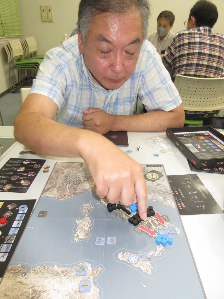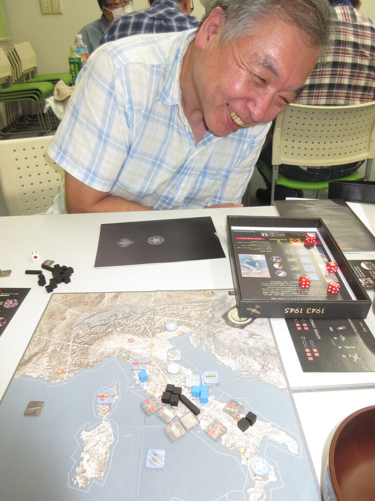 この日の最後にプレイしたのが、若月さん持ち込みの「デシジョン・イン・イタリア」(Bonsai Games)です。手順は、主導権側か交互に、2回の移動・攻撃を行うシンプルなものです。戦闘は、最大で4d6して6でヒットで、戦車・空軍で各+1dr修整がつきます。