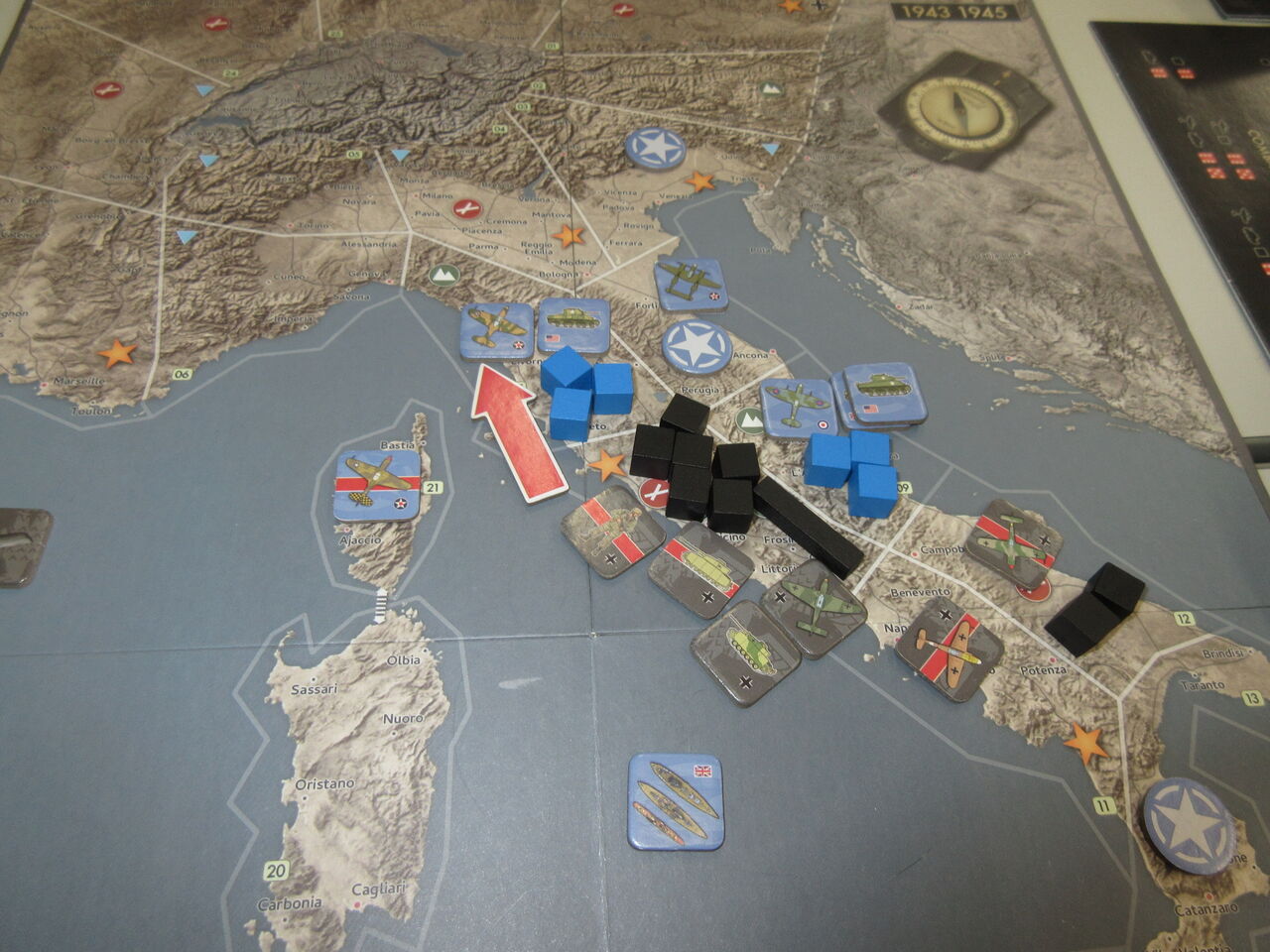 第5ターン、先手を取った連合軍はFirenze(エリア07)を攻略し、枢軸軍には北イタリアへの侵攻を止める手立ては、ほぼなくなります(増援を送れても、沿岸沿いに海上輸送で僅か2ユニット)。09と07を固める連合軍に、枢軸軍が南からの反撃を繰り返しますが、どうしてもこれを破れず。