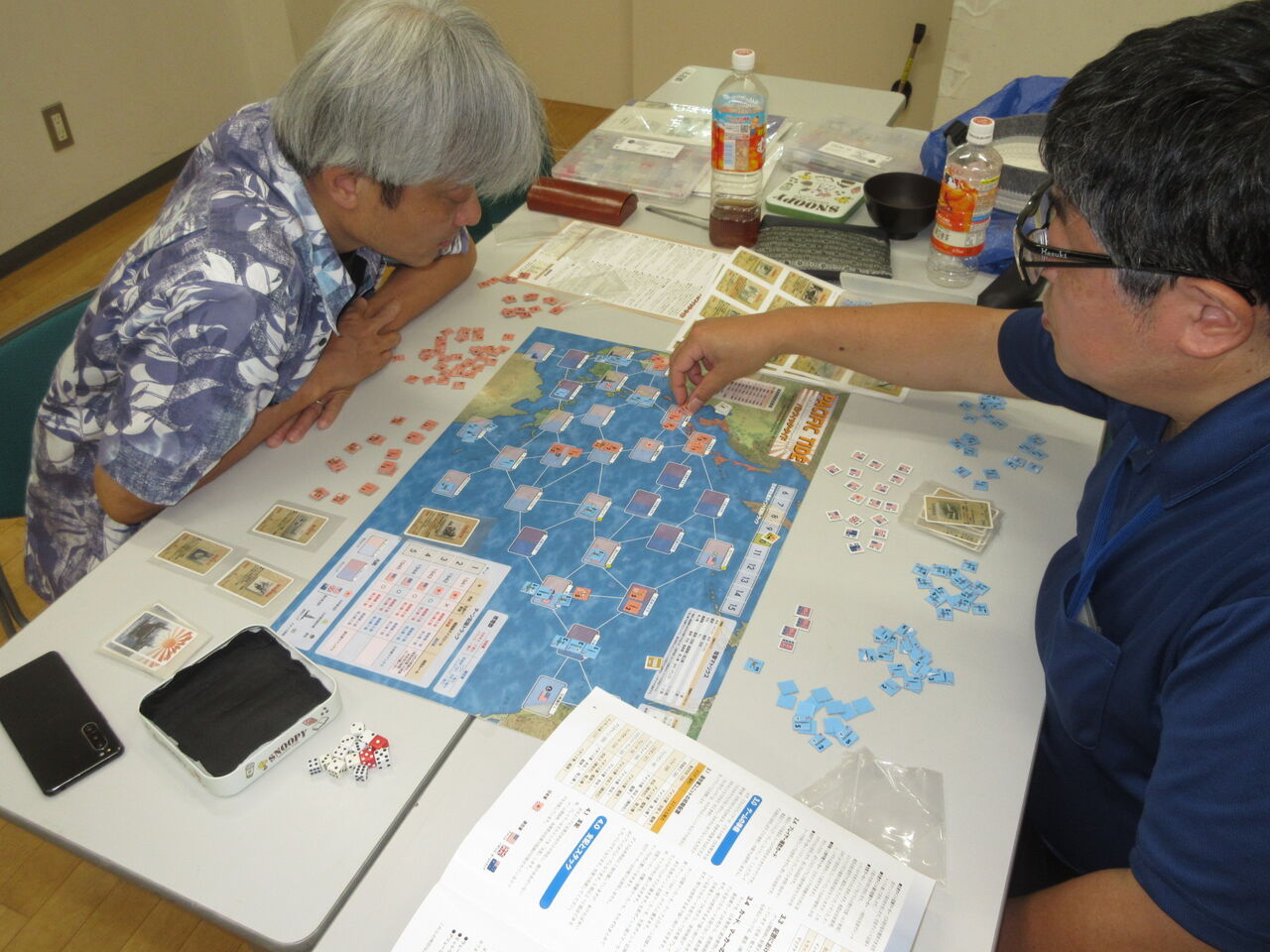 東部戦線のキャンペーンがあるなら、太平洋戦争もと、「パシフィック・タイド」(Bonsai Games)を日本軍(j)対連合軍(morita)でプレイ。ルールはシンプルながら、カードの組み合わせと戦略的が必要な佳作で、楽しくプレイしていました。