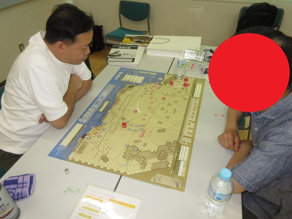 真夏にぴったり(?)の「砂漠の狐」(CMJ)を、イギリス連邦軍(ライン)対枢軸軍(oha)で対戦。中盤を過ぎ、イギリス軍が反攻を開始するも、海岸道でイタリア軍(!)の待ち伏せに遭い、この訪問のイギリス連邦軍が壊滅!すわ、ドイツ軍の突破で終了かと思いきや、付近にはイタリア軍しかいない!危うく難を逃れたイギリス軍(ライン)が、枢軸軍(oha)を押し切って、勝利していました。
