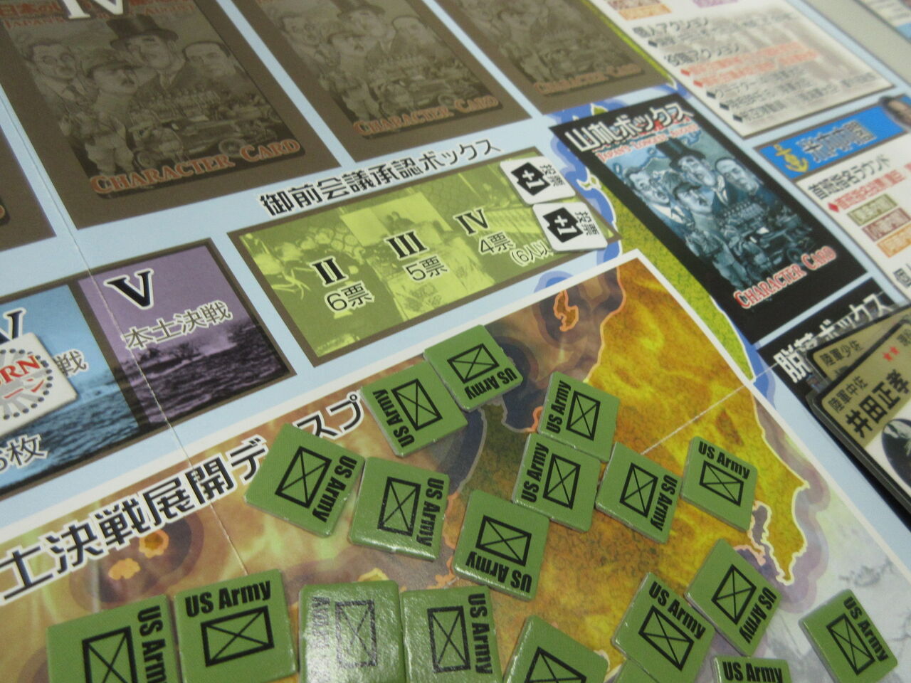 が、やっぱり、憲兵は怖いと、第2ターン、東條が危険視されて、あるあるの小磯内閣が発足します。アクションでは、陸軍を固めたエンジョウ陣営が、次々と(一銭五厘で)陸軍師団を本土に集結させます。同時に、テロリストを嬉々として手に入れます。これは明らかに本土決戦しか考えていないゾ。