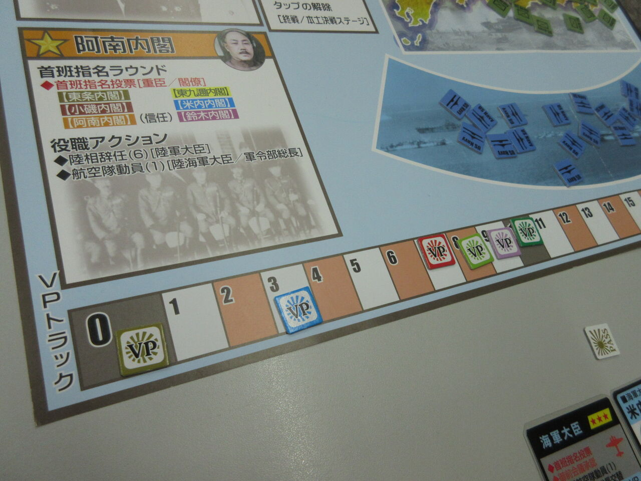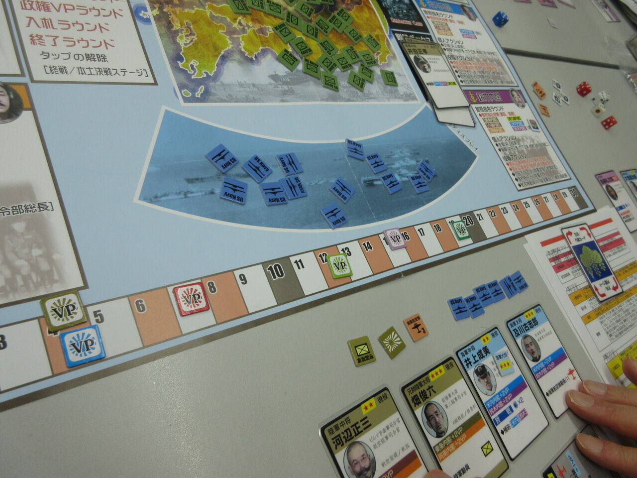 ところが・・・ここで、海軍軍令部長を持つ若月陣営が、二度目の航空隊出撃を命じます。確率的には2-3ユニット程度の戦果のはずが、若月陣営と平陣営ともに、なんとほぼ全機が攻撃成功!もちろん、幻の台湾沖港空戦(ほとんどが0VP)の可能性もありますが、両陣営の敵海軍の「撃破」数が合わせて6ユニットを超え、俄然、本土決戦に傾きます(一発当たれば、逆転できずゾ)。和戦どちらになるのか、最後まで読めない展開に。