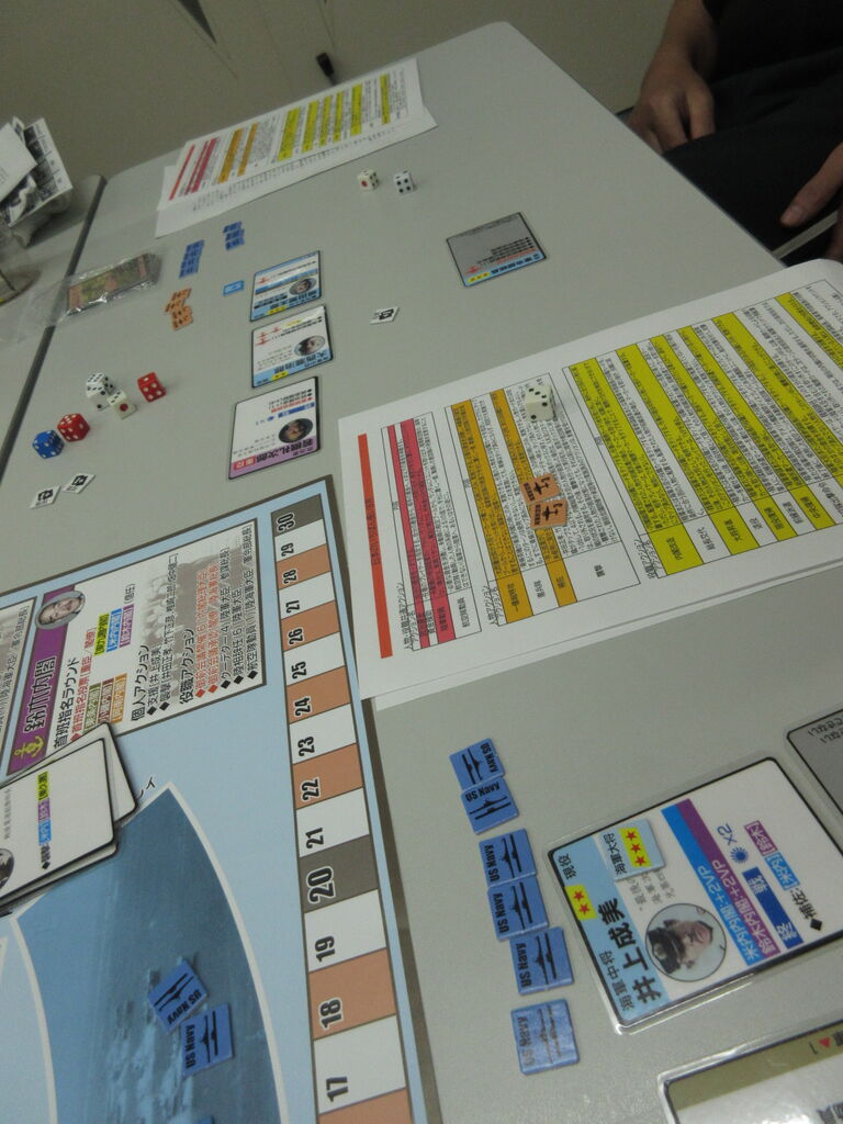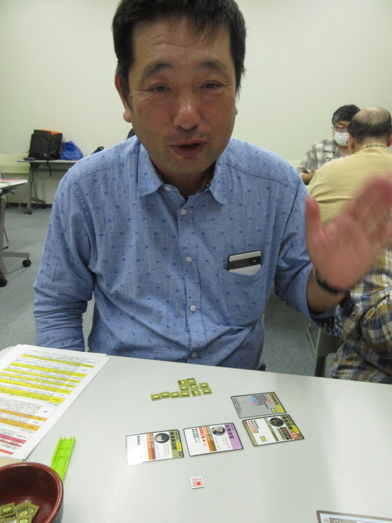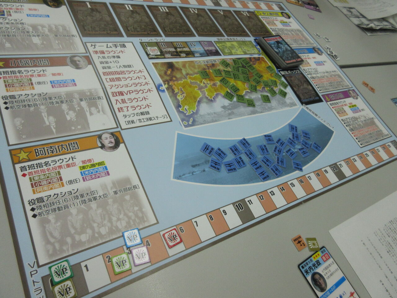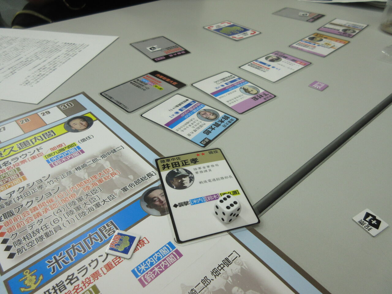 この日にプレイしたかったのが、戦争末期の政略戦を描いた「日本のいちばん長い8月」(GJ)でした。前回、茨城会で4人プレイができ、感覚が掴めたので、ちはら会でインストとしました。平・BIBI・エンジョウ・バーネット・若月・mitsuの6人プレイです。 まず、セットアップで、人物の激しい獲得戦となり、東條をエンジョウ陣営が、小磯をBIBI陣営が、米内を平陣営が獲得します。