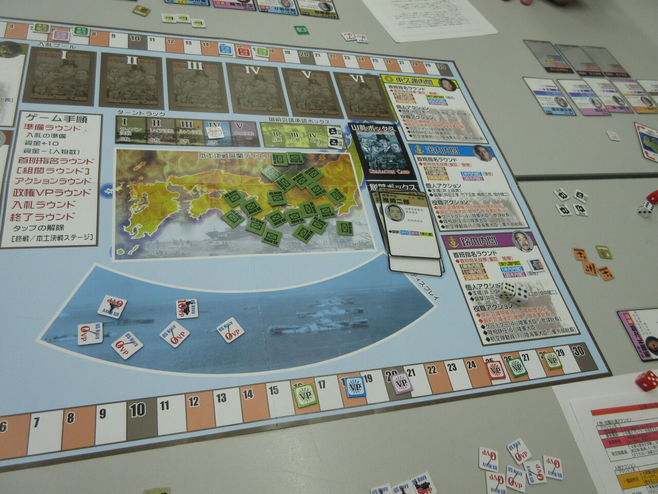 そして始まった本土決戦!陸軍を貯め込んだエンジョウ陣営が25点まで伸ばしますが、陸海にバランスよく影響力を広げていた26点のBIBI陣営には届かず。そして、奇跡を起こしたのが、前ターンまで最下位だった平陣営。航空攻撃で僥倖の20点を挙げ、終戦VPと合わせて、28点の大逆転勝利に!