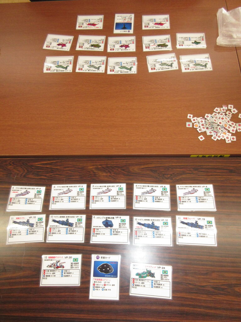この日の緒戦は、対戦待ちの間の「Ships&Tactics」(グループ乾坤一擲)です。ちはら会の十八番で、ジオン公国軍(morita)対地球連邦軍の対戦になります。