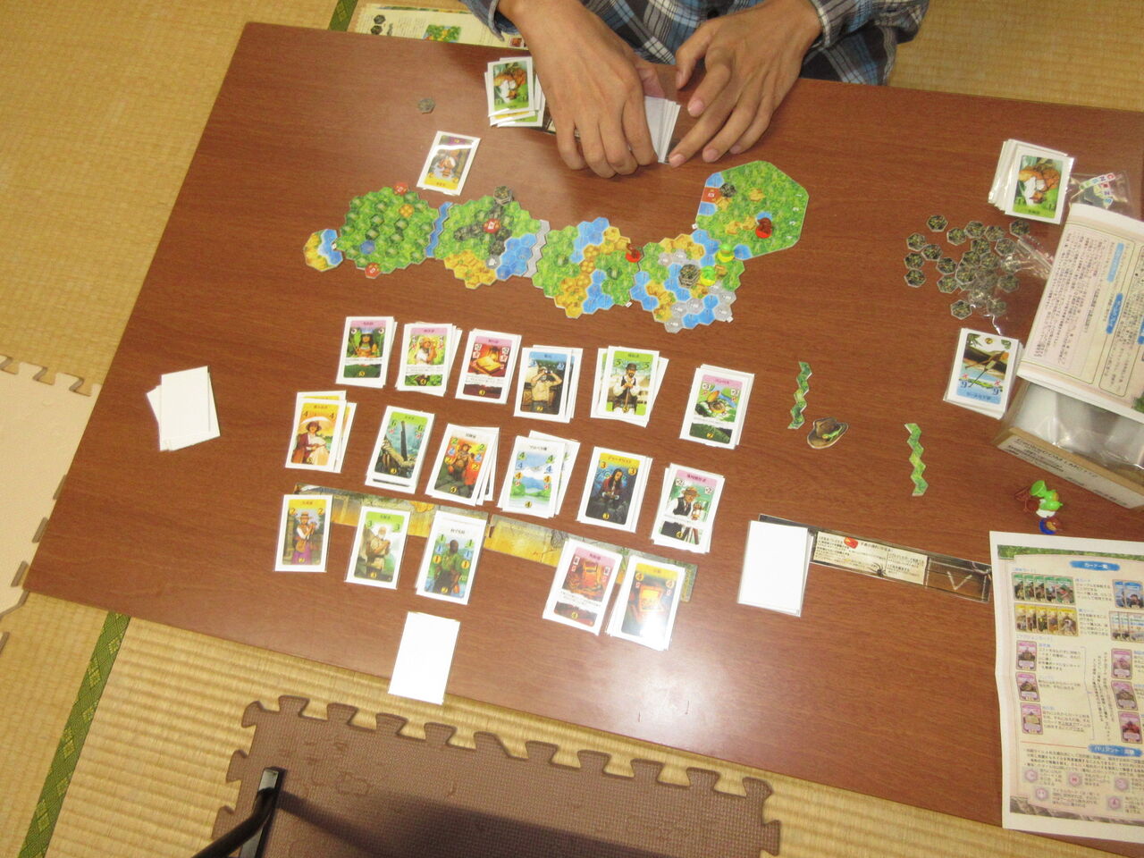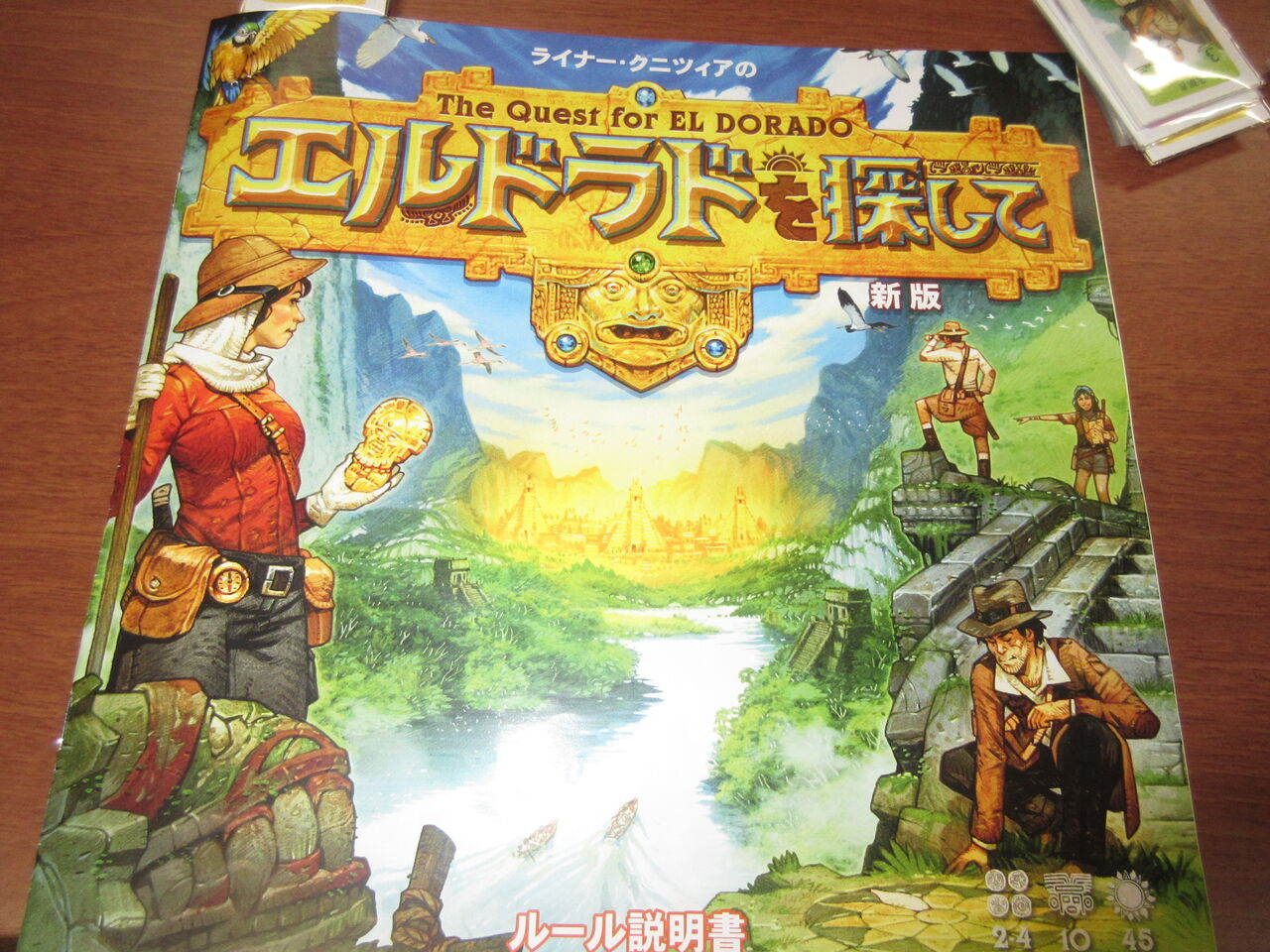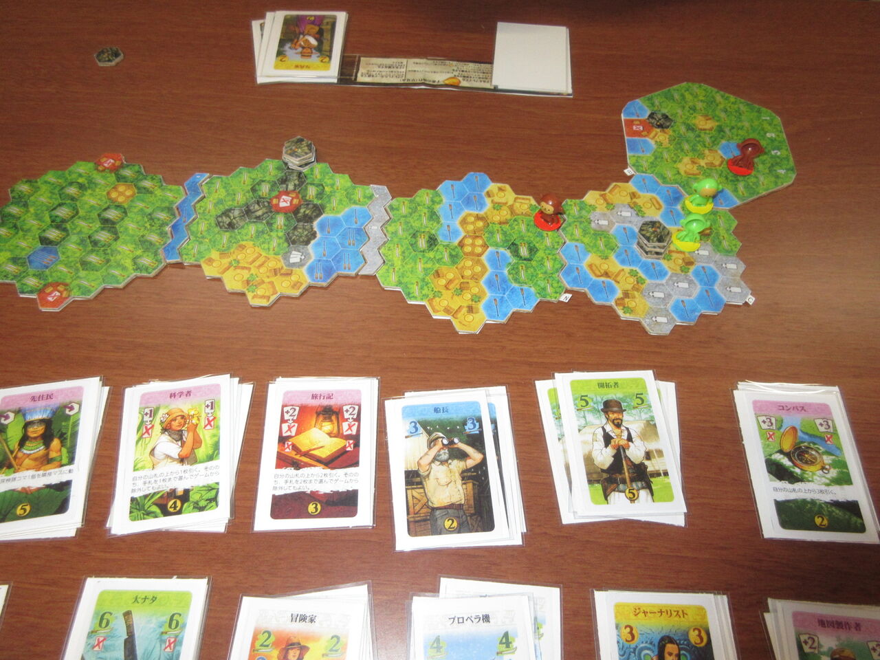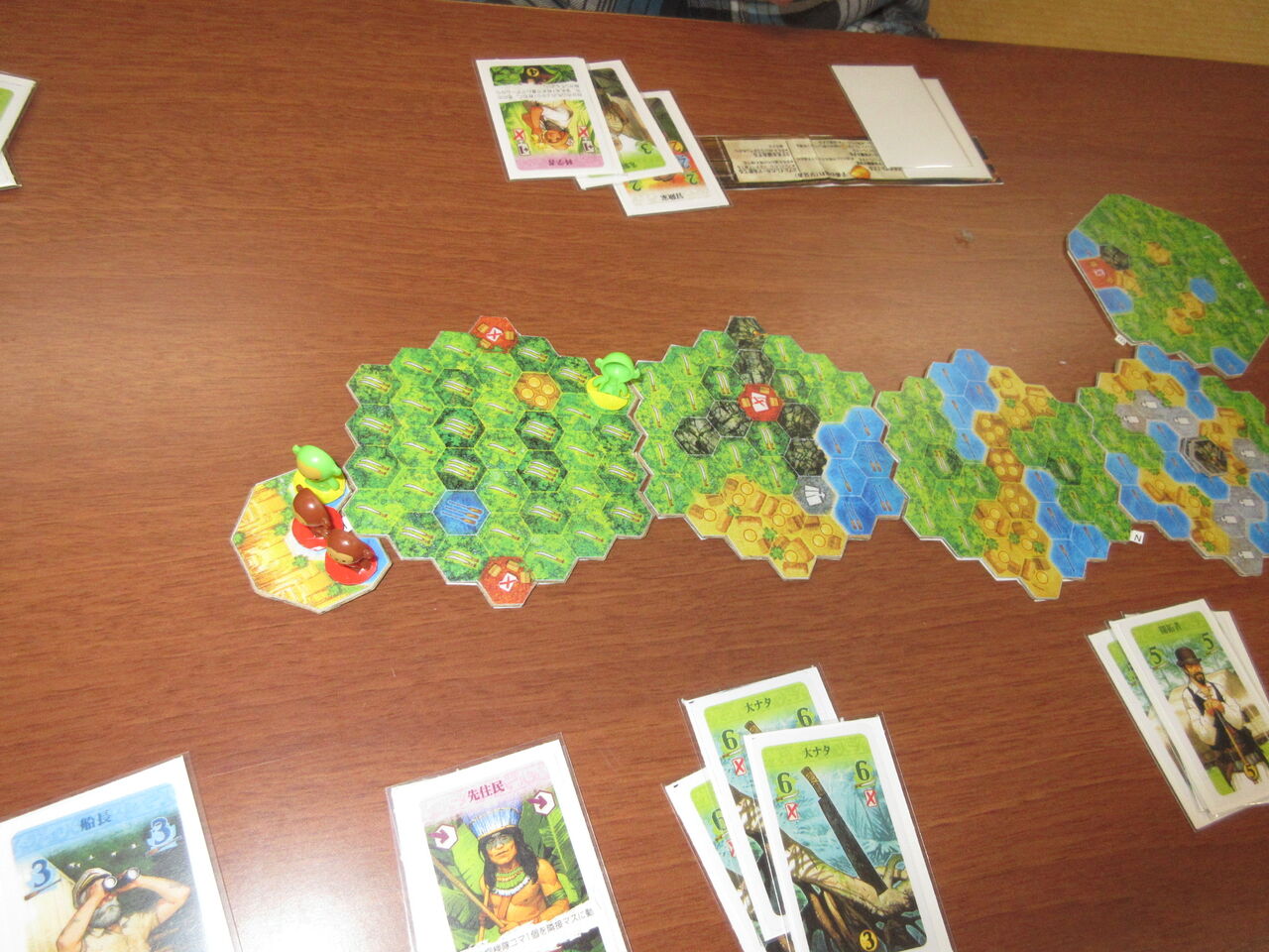 続いて、BIBIさん持ち込みの「エルドラドを探して」(アークライト)をプレイしました。いわゆるデッキ構築型の進行・探索ゲームで、先にエルドラドへの到達したプレイヤー(2人の探索者とも)が勝利します。ジャングル、村、河の各地形を渡るためには、冒険者、旅行者、水夫などのカードが必要になります。旅行者は金を持っており、それを使ってさらに能力の高いカードを購入できます。カードや地形によっては、平凡なカードの廃棄(いわゆる圧縮)ができ、より効率のよい進行が可能になります。