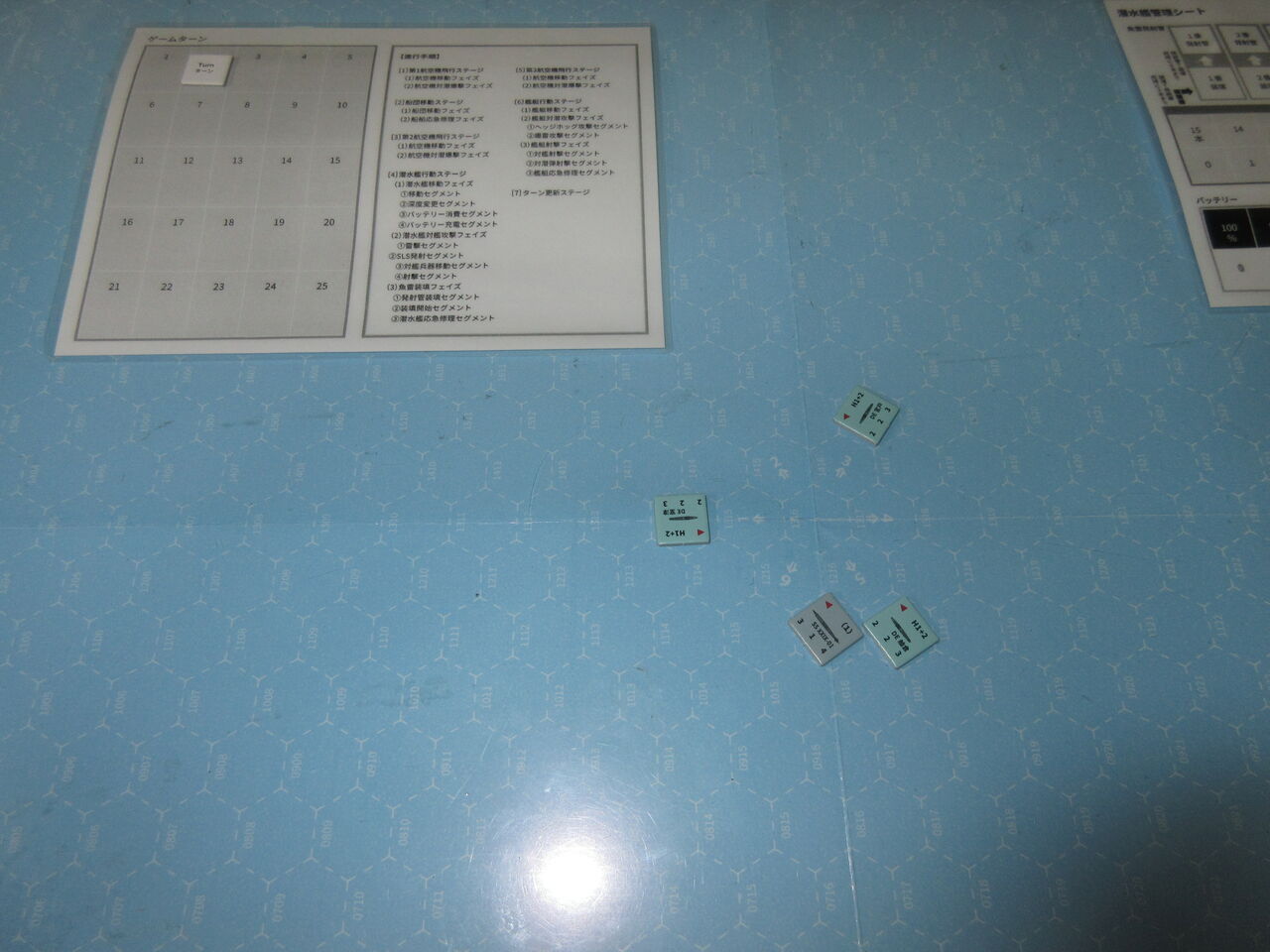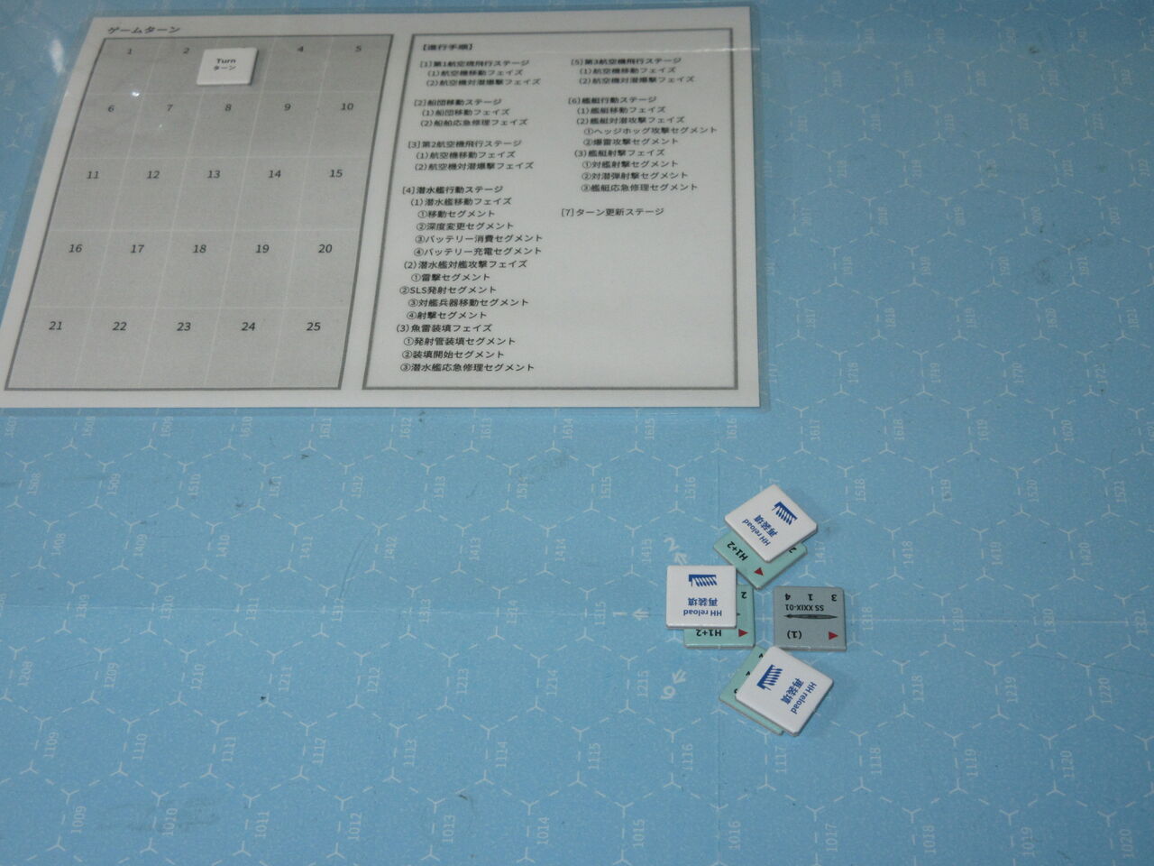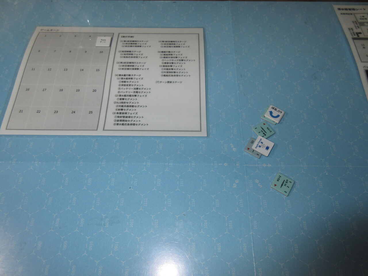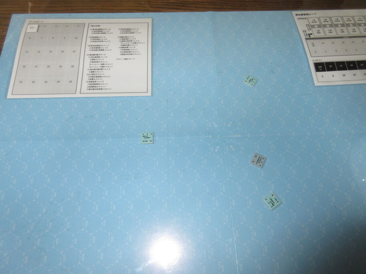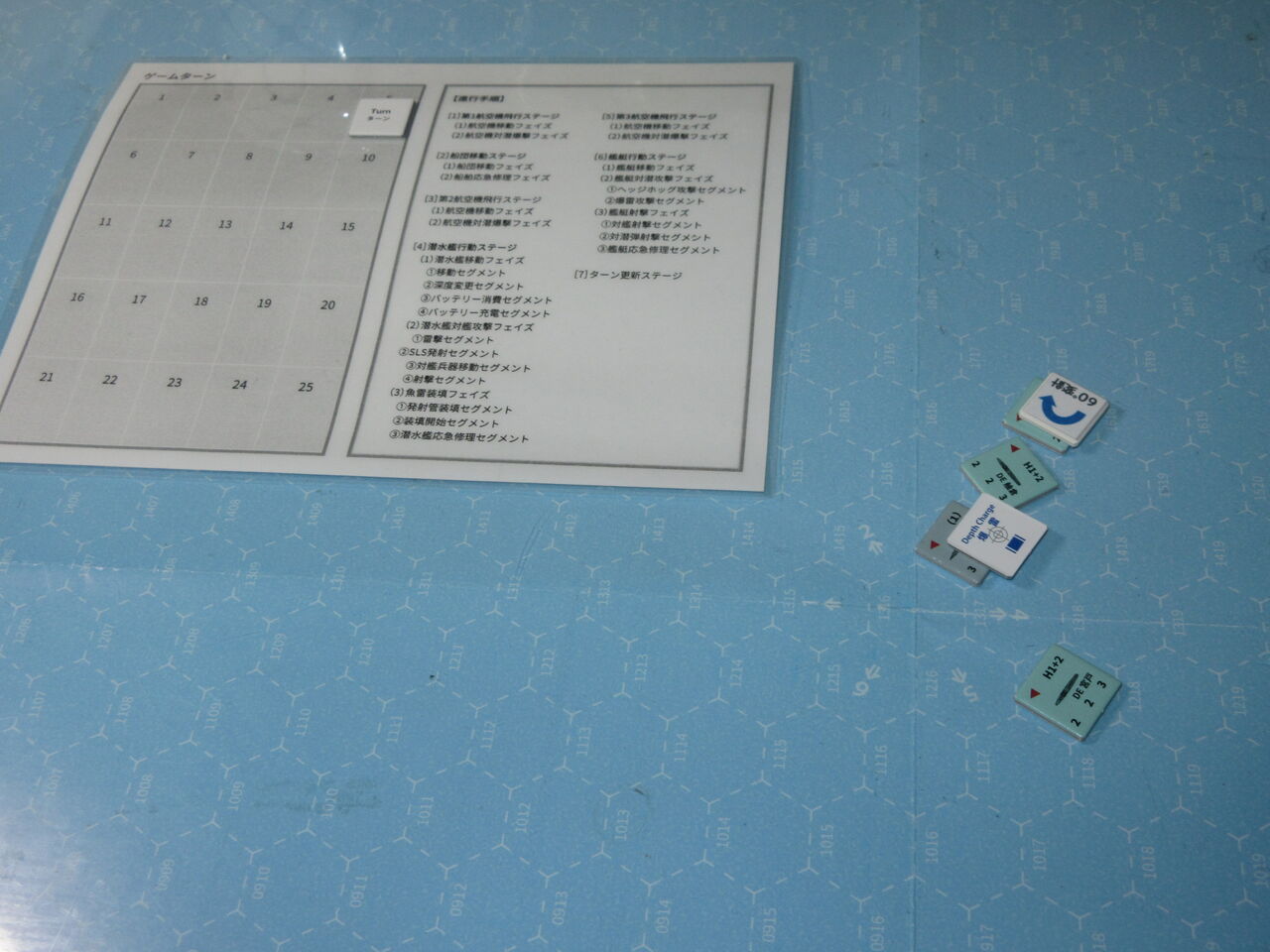 今回はハンターチームが足の遅い海防艦ということもあり、かつ、Uボートの頻繁な深度変更と回避機動に翻弄された形です。「見える化」によって、護衛艦側が有利とは言え、足の速いⅩⅩⅠⅩ型を捕捉するのは、かなり困難であり、ゲームバランスはこの状況でもUボートに有利と言えます。その中で、実質、4回の攻撃(HH3回、爆雷1回)を実施できたのは、幸いか。2d6があと一つ、数値が変わっていたら・・・と思えるソロ演習でした。