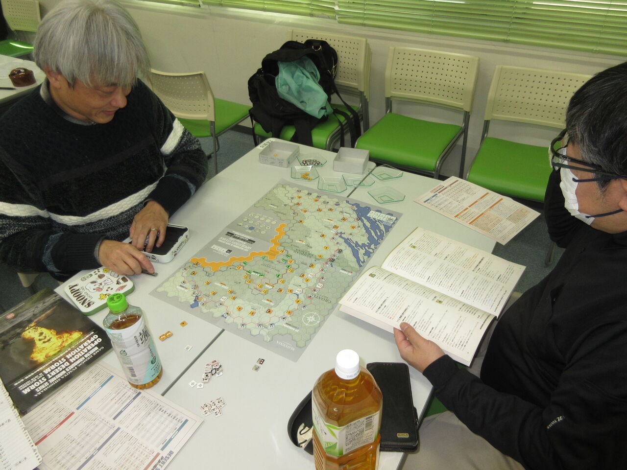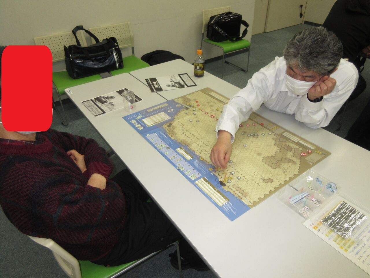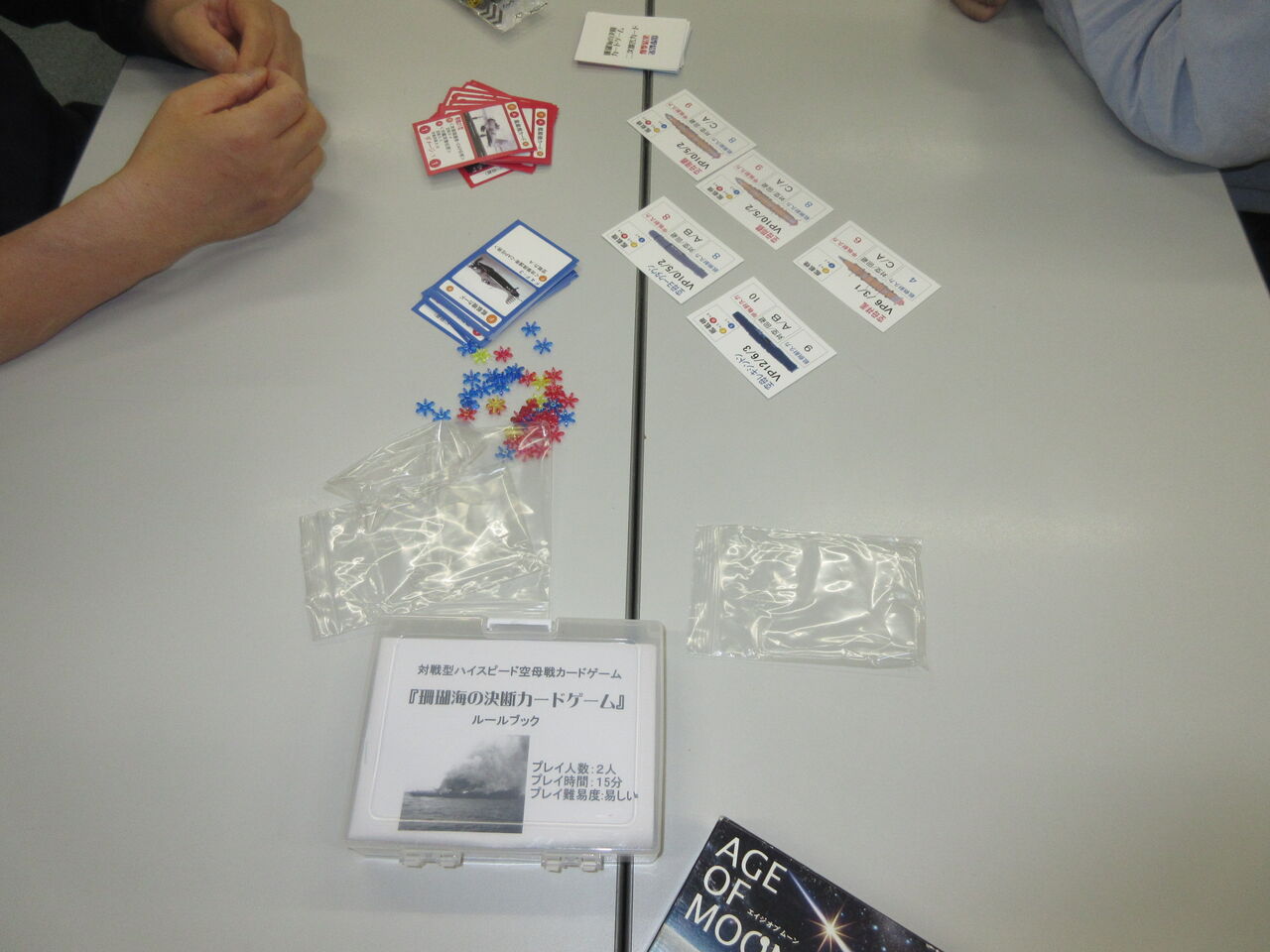 グループ乾坤一擲のハイスピード空母戦カードゲーム「珊瑚海の決断カードゲーム」を、日本軍(バーネット)対アメリカ軍(平)で4連戦していました。一戦があっという間に終わるので、繰り返しプレイされ、各軍の勝利が1戦ずつ、引き分け2戦と、がっぷり四つの対戦でした。