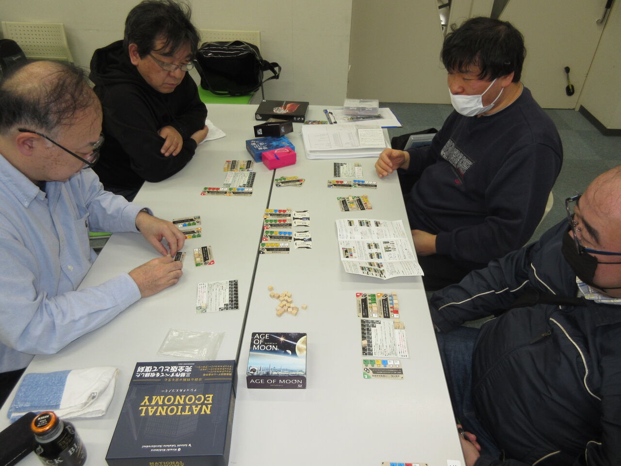 月開発のSFカードゲームの「エイジ・オブ・ムーン」(サザンクロスゲームズ)を、バーネット・ゆいしか・kawa・平の4人で対戦。この手のゲームのコツを掴むのが旨いバーネットさんが、持ち込んだ平さんを躱して、勝利でした。