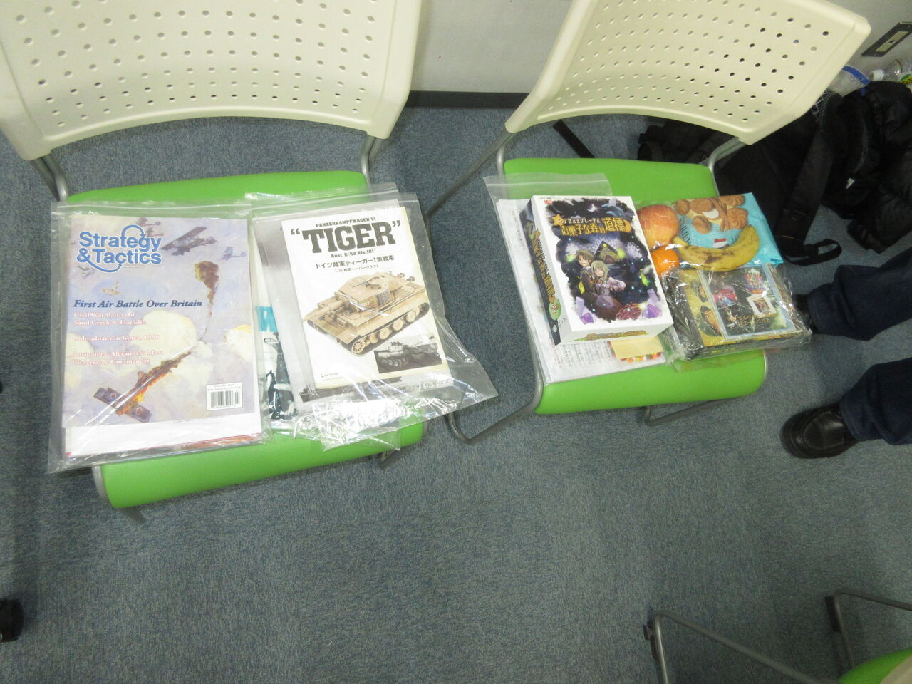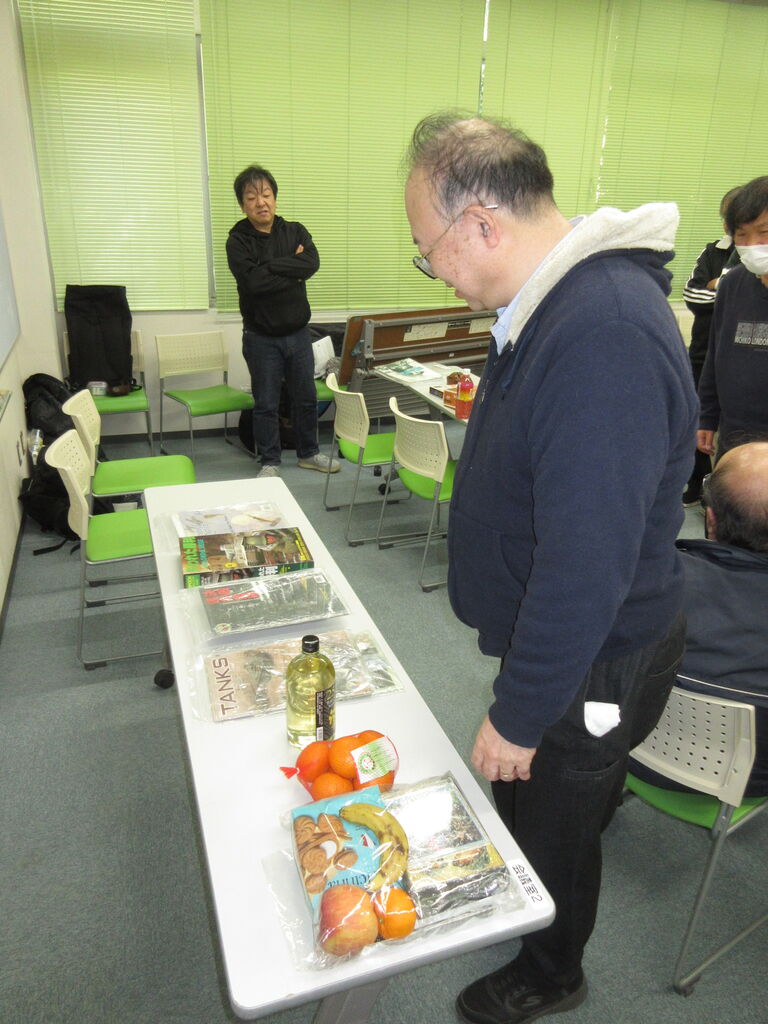 平さん持ち込みの「CROWNSWORD」(RYUSEI GAMES)。ネットによれば、「1~4人用で遊べるカードを使用したボードゲーム。配られたカードの中から1枚を選び、場に出し、カードの効果を使用して勝利を目指す。場に出たカードの効果は使用順番が決まっており、強いカードほど順番は遅くなる。そして、同じターンに同じカードが出た場合はバッティングし、効果を使用することが出来なくなってしまう。弱いカードは枚数が多く、強いカードは順番が遅い。その絶妙なバランスが楽しい作品になっています!」だそうで。BIBI・バーネット・平でプレイしていました。バーネットさんが5勝、BIBIさんが4勝だったそうです。 この日は、14時から恒例のちはら会お年玉が行われました。自宅にあるプレイ済みのゲームや断捨離に入ったアイテム、千葉会で専用に手に入ったシミュレーション、お菓子捜索ゲーム(?)、TIGERⅠのクラフトモデル、北陸の銘酒、茨城名物の詰め合わせ、蜜柑、果物と戦争映画のDVDなどが出品され。2d6して、ハイロールの人から、好みの物をゲットしていきました。