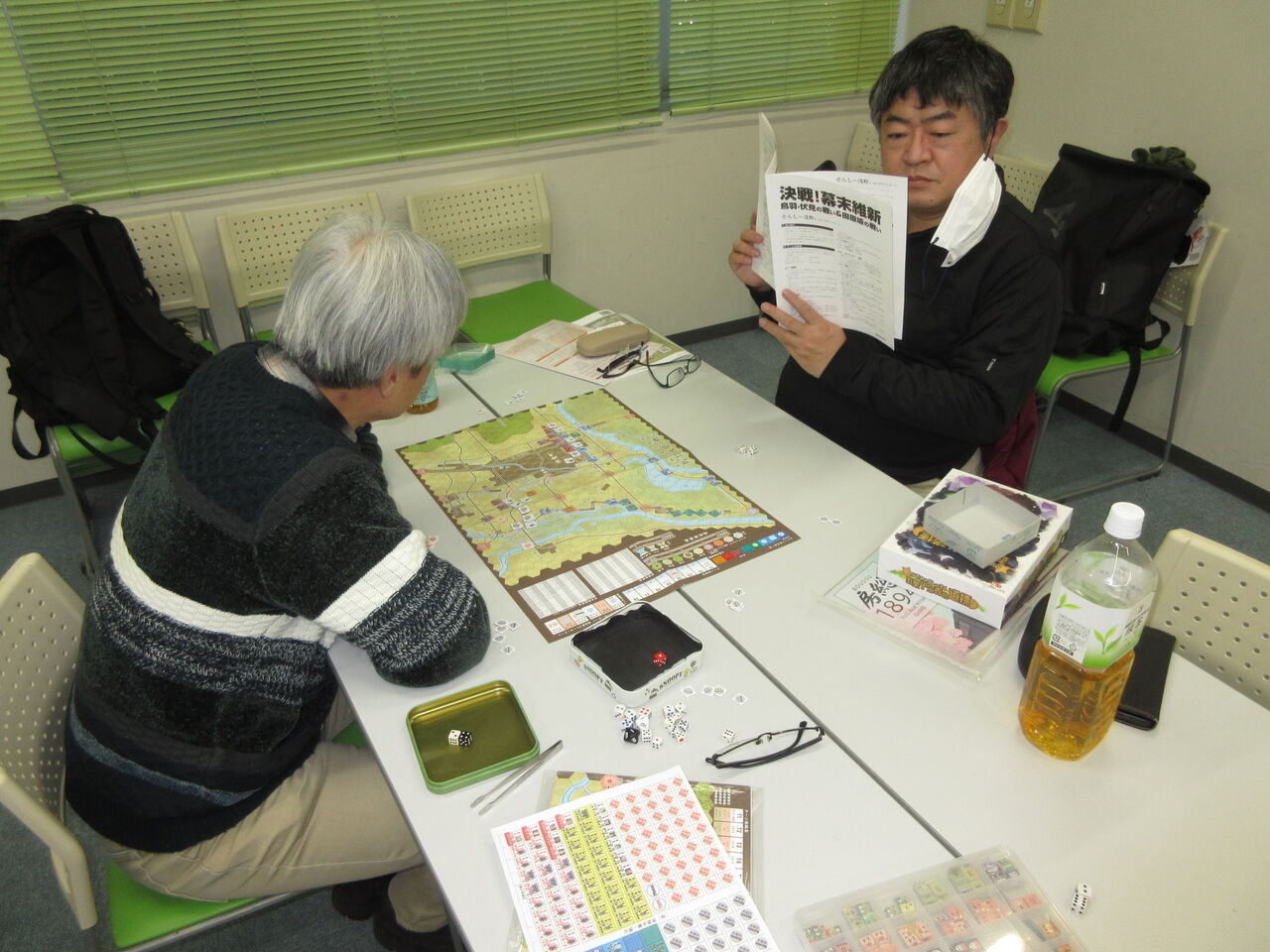 そのままの流れで「決戦!幕末維新:鳥羽伏見の戦い」(GJ)を、幕府軍(morita)対薩長軍(j)が対戦。「会津藩が全然、役に立たん」といいながら、幕府軍が数を生かして、薩長の機動を止め、勝利していました。