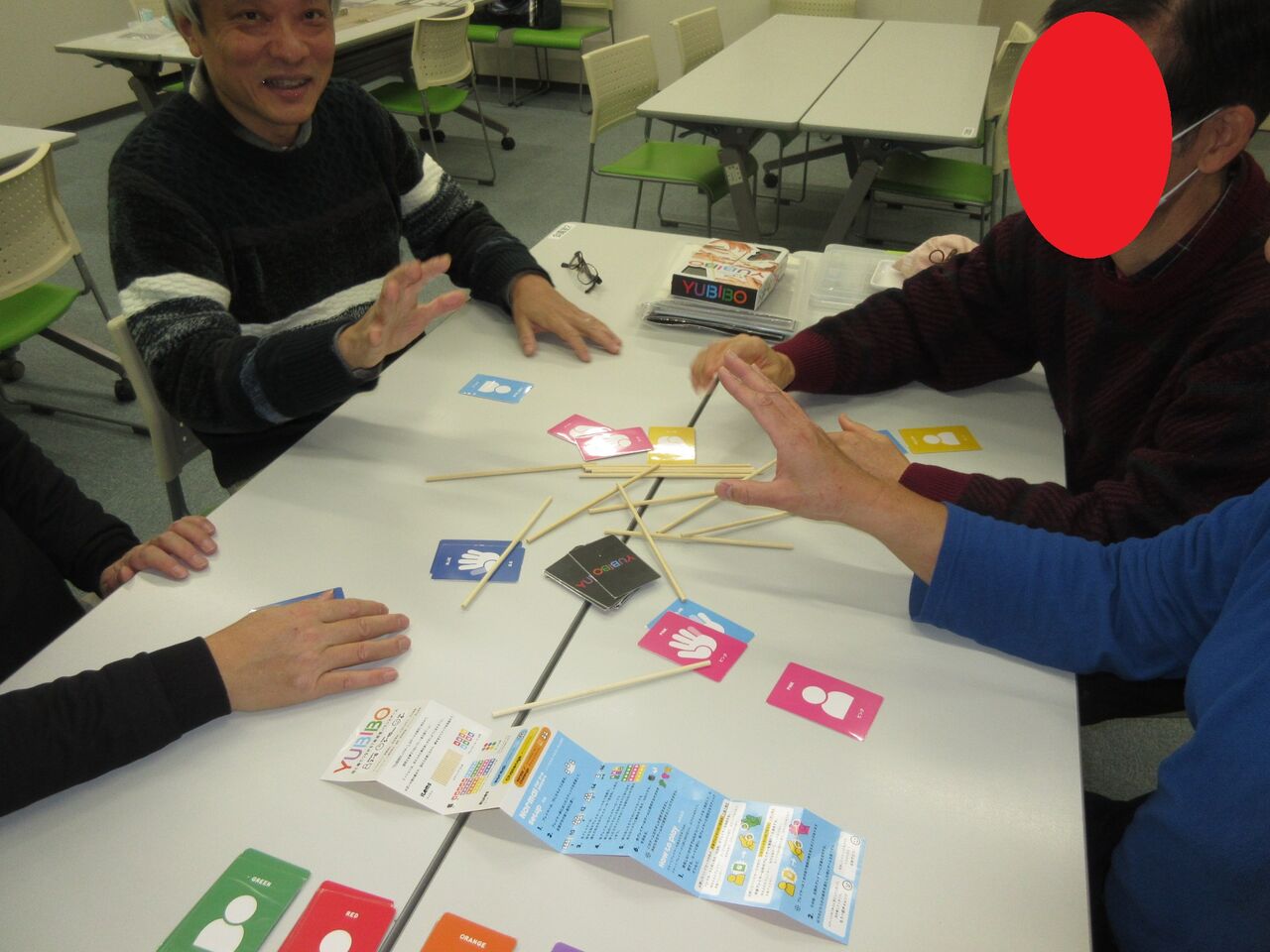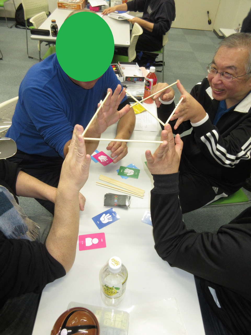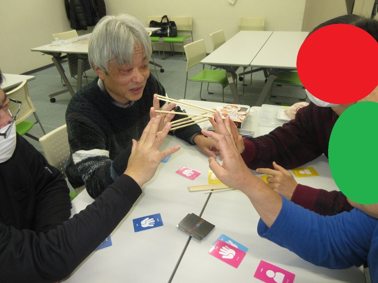 みなさん、アラ還暦で身体も指も硬くなっていて、支える指がぷるぷるし、つなぐ指を間違えたり。「肘をついて安定させよう」(高齢の機能訓練か?!)「いい組み合わせを祈ろう」(ほぼ、神頼み!)と10数戦、健闘するも、指定の半分にいったのは2、3件だけと大惨敗・・・・。最大8本を繋げたのは、奇跡だぁ~(全12本)。